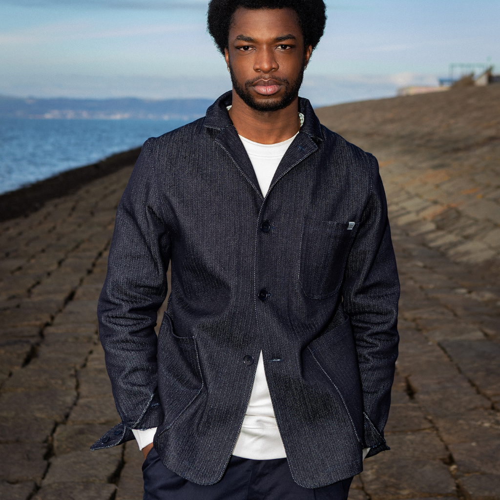 The fabric is Orta denim herringbone, sourced from Turkey. But the jacket itself? Every pleat, stitch, and recycled button is sewn right here at home.