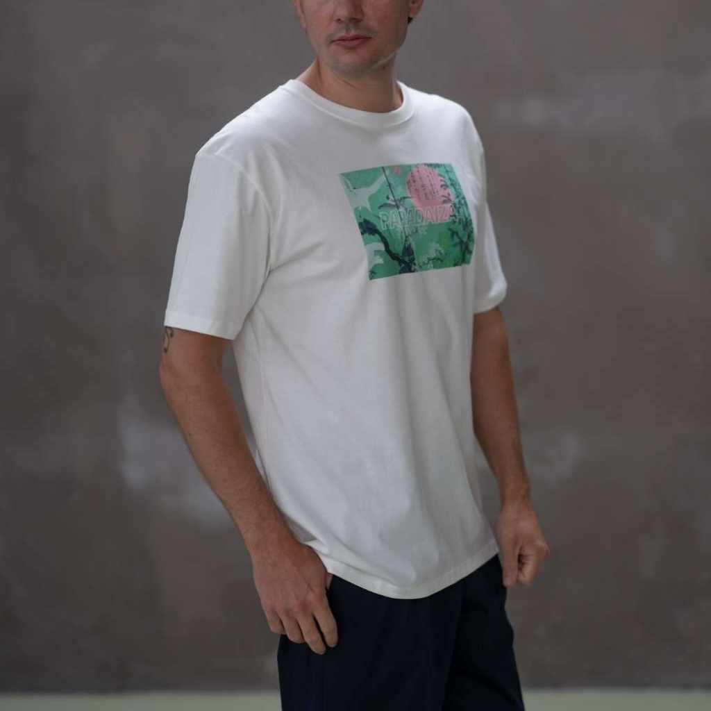 The Pink Sun T-Shirt in White Ivory, now cut in our new relaxed fit — sitting perfectly between our Regular and Oversized silhouettes.